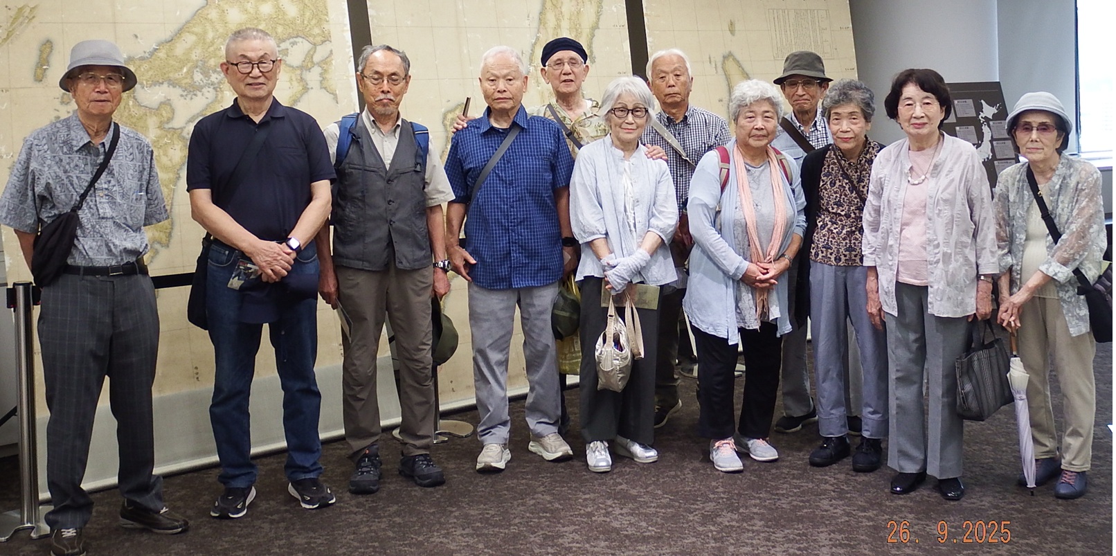当番 中村 勝年 今回は、9月26日(金)、北九州市街地に散在する文化施設のうち、 開館5周年を迎えた歴史を映し出す地図の博物館「ゼンリンミュージアム」 及び戦後80年、市民の戦争体験や当時の暮らしを物語る資料を保存している 開館3年目の「平和のまちミュージアム」の見学会を行いました。 参加者は、男性会員が木下、岩松、奥、小林、村田、吉田、中村、 女性会員が仲、桜井、永田、藤田、諸富、 計12名。 9月26日(金)9:50に小倉室町「リバーウオーク」に全員が集合、 4階のゼンリン受付にて入館手続き後、 シアターにてオリエンテーションビデオを視聴。 14Fの博物館に入場。 文字よりも古いといわれる地図の歴史、紀元前に作られた現存最古の世界地図と言われている 「バビロニアの世界図」の紹介や、日本国内では19世紀の初め、 「鎖国」体制下で伊能忠敬により17年かけて作成された日本初の実測全図である 「伊能図」の展示等を学芸員の説明を受けながら鑑賞しました。 ゼンリンの資料がが膨大であったため、予定より若干遅れて退出し。 小倉城内を徒歩10分、小倉陸軍造兵廠跡地(58万3,000m2、東京ドームの約12.5倍)の北部に 立つ「平和のまちミュージアム」に到着。 開館3年目であり、造兵廠跡の多くの実物資料とダイナミックな360度シアター内の 最新の映像・音響技術を活用した動画を楽しみました。 特に、運命の昭和20年8月9日、原爆を搭載した爆撃機が小倉上空に飛来し長崎に向かった 出来事を、もしもあの時・・・と臨場感で追体験できました。 2か所のミュージアムを見学後、昼食を近隣のホテルで摂る。 希望者で造兵廠跡地の一部「大手町公園」まで20分ほどのウオーキング、 記念碑に詣で、解散しました。 以上 |