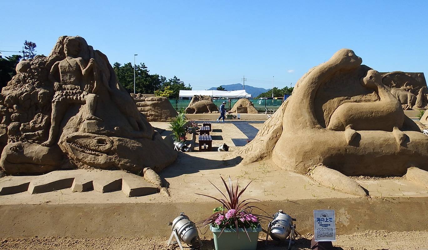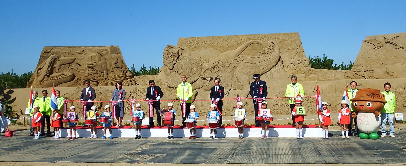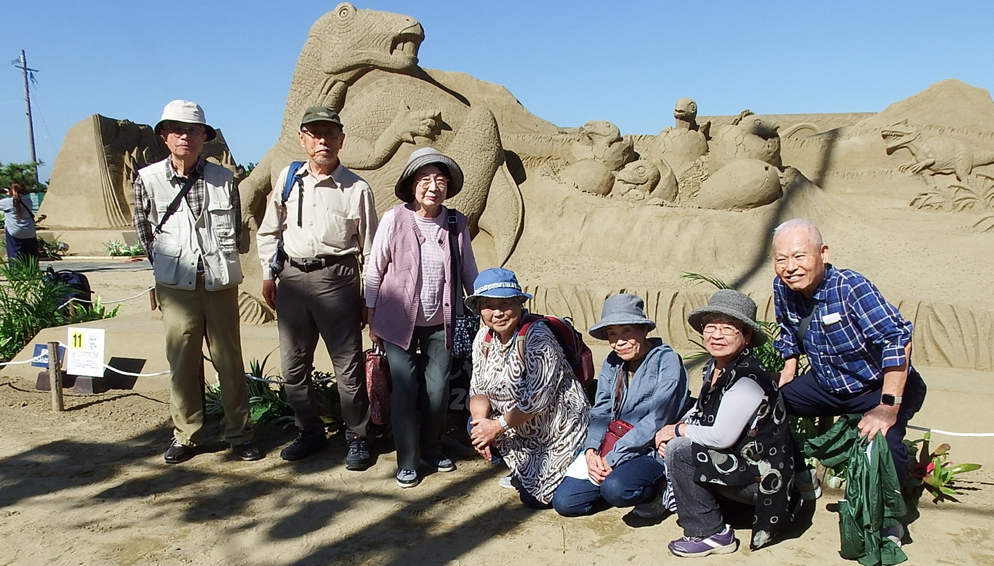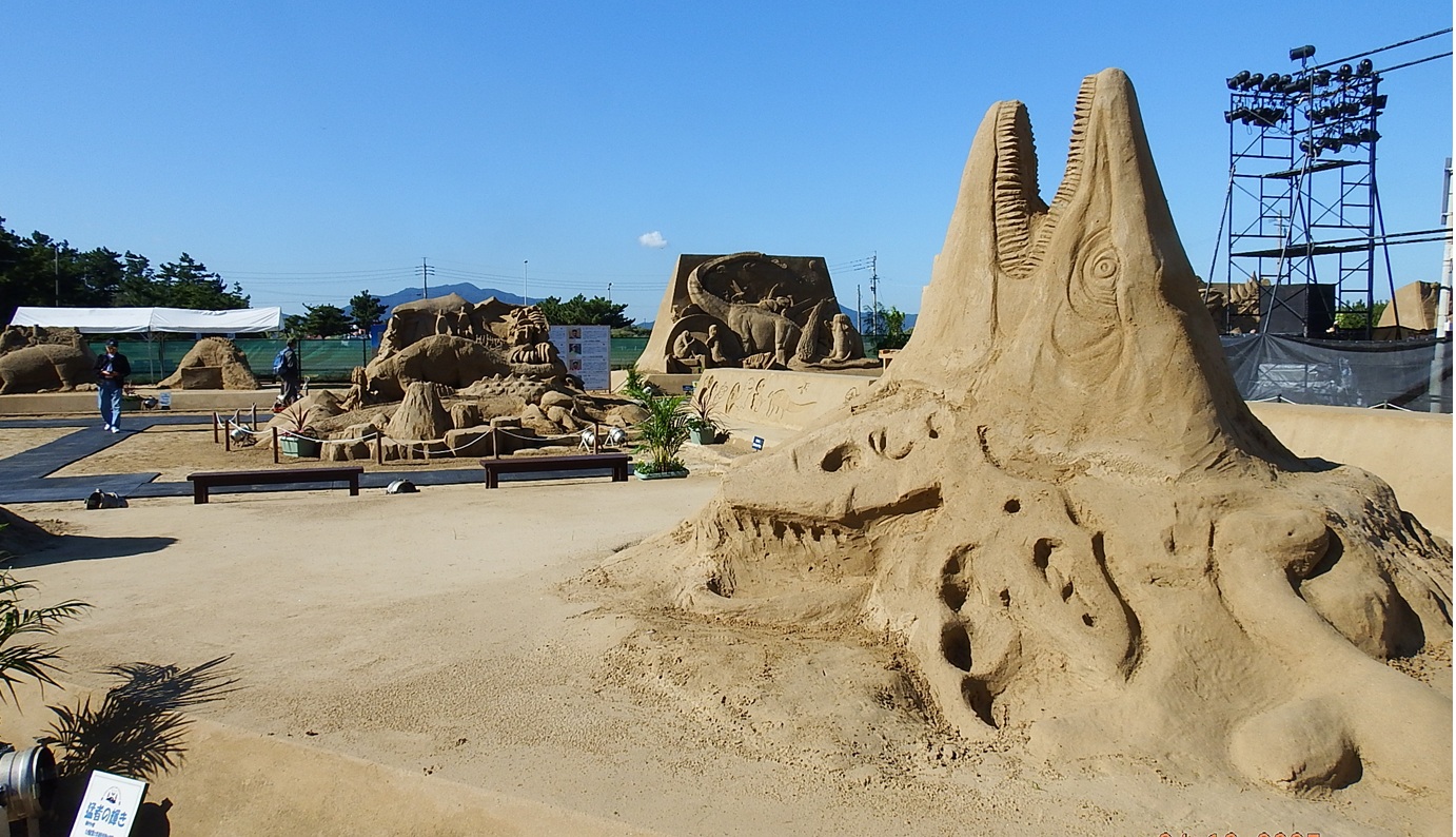 | 中村 for 仲さん 六根会10月例会は、仲 幸江さんを中心に女性幹事の企画による 「芦屋砂像展」及び「芦屋釜の里」の見学、散策を楽しみました。 10月24日(金)、爽やかな秋晴れの下、 木下、小林、吉田、仲さん、諸富さん、桜井さん、関野さん、中村の8名が JR遠賀川駅に集結、駅前からコミュニティバスで砂像展の 会場である芦屋海浜公園に向かう。 当日が砂像展初日であったため、オープニングセレモニーが行われ、 各界の代表挨拶や可愛い幼稚園児のバンド演奏等のイベントの後、砂像を鑑賞することになりました。 今回の砂像展のテーマは「恐竜」であり、国際的な砂像彫刻家による大小、様々の精緻な35基の作品が 展示されており、十分に鑑賞しました。 砂像展の鑑賞後、近くの国民宿舎「マリンテラス」で響灘の絶景を楽しみながら、昼食。 食後、希望者のみで近傍の「芦屋釜の里」を見学しました。 室町時代には茶の湯釜の名器として一世を風靡した芦屋釜、重要文化財の多くを占めており、 表千家の教授資格を持つ仲さんの解説を聞きながら、抹茶でご接待頂き、有意義な一時を過ごし、 帰途につきました。 以上、 |